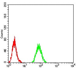 - Flow cytometric analysis of Raji cells using RAB11FIP1 mouse mAb (green) and negative control (red).