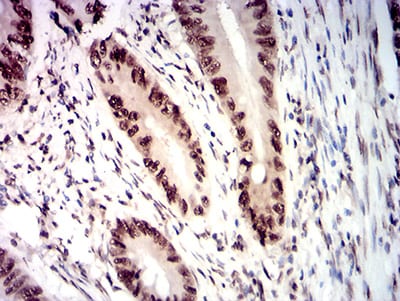 - Immunohistochemical analysis of paraffin-embedded human rectum cancer tissues using RBBP7 mouse mAb with DAB staining.