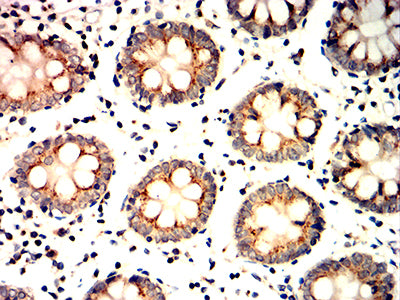 - Immunohistochemical analysis of paraffin-embedded human colon tissues using GOLGA2 mouse mAb with DAB staining.