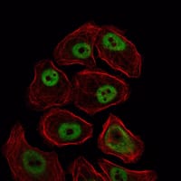 - Immunofluorescence analysis of NIH/3T3 cells using SMC1 mouse mAb (green). Red: Actin filaments have been labeled with Alexa Fluor-555 phalloidin.